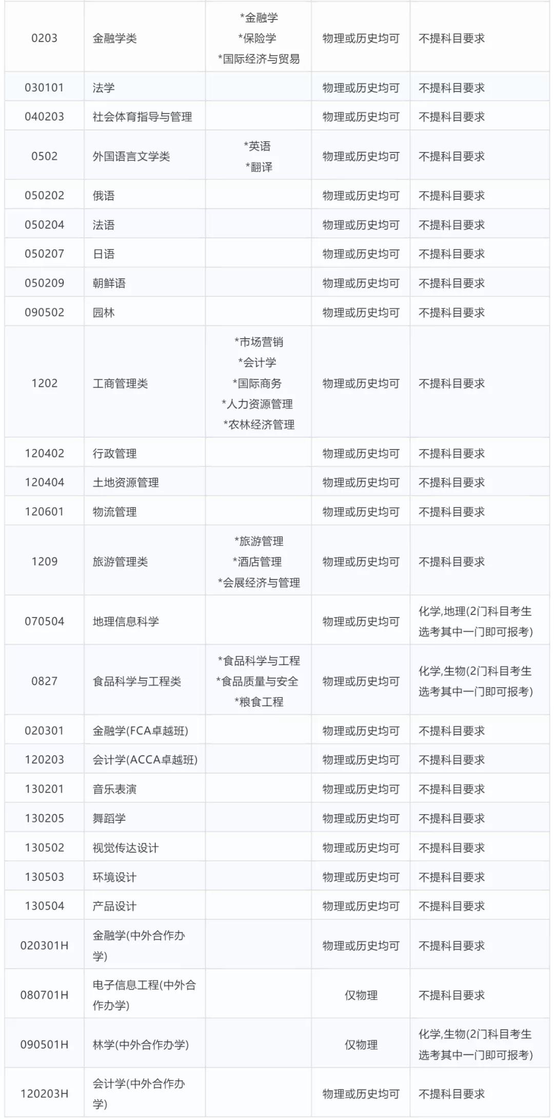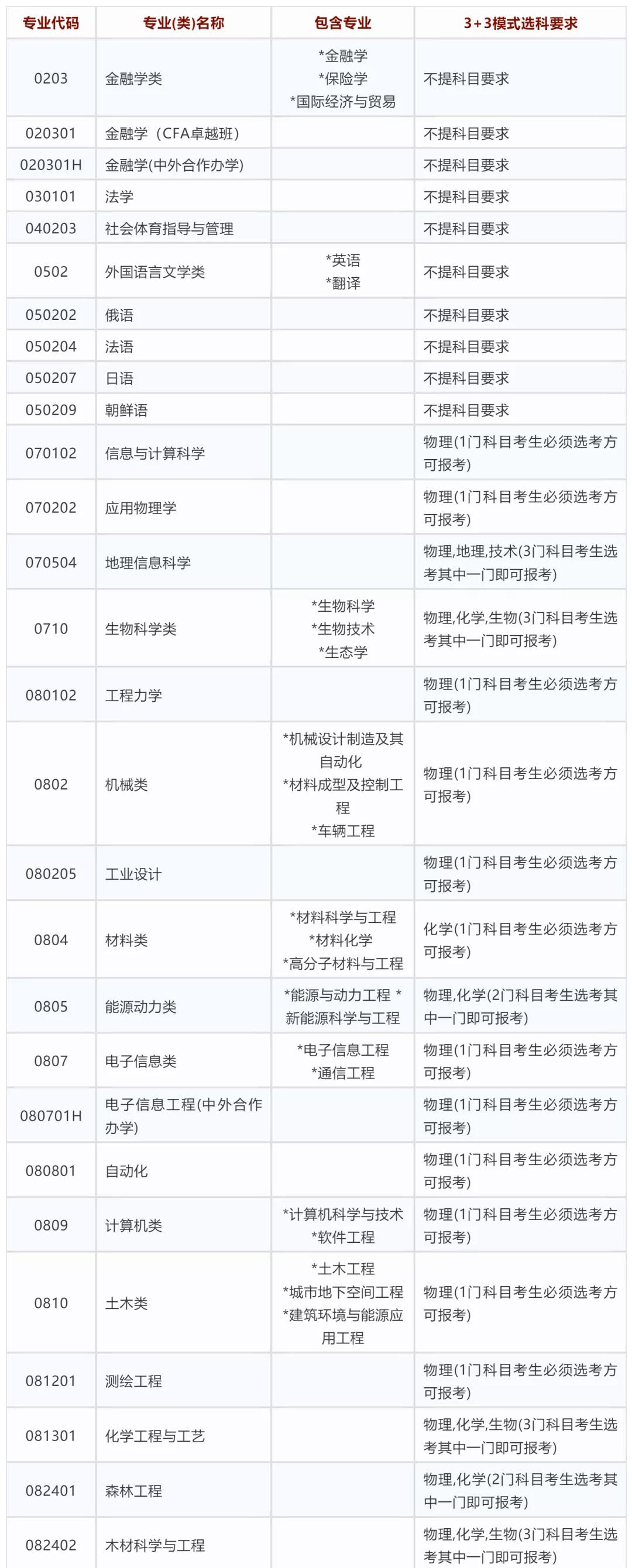 说明:下表信息为我校现有本科专业(类)对高考综合改革“3+3”选考模式提出的选考科目及要求,所列专业(类)是否在生源省有招生计划,须查阅生源省省级招考部门公布的年度我校招生计划信息。下表中的信息如有变化,以生源省省级招考部门公布的信息为准。